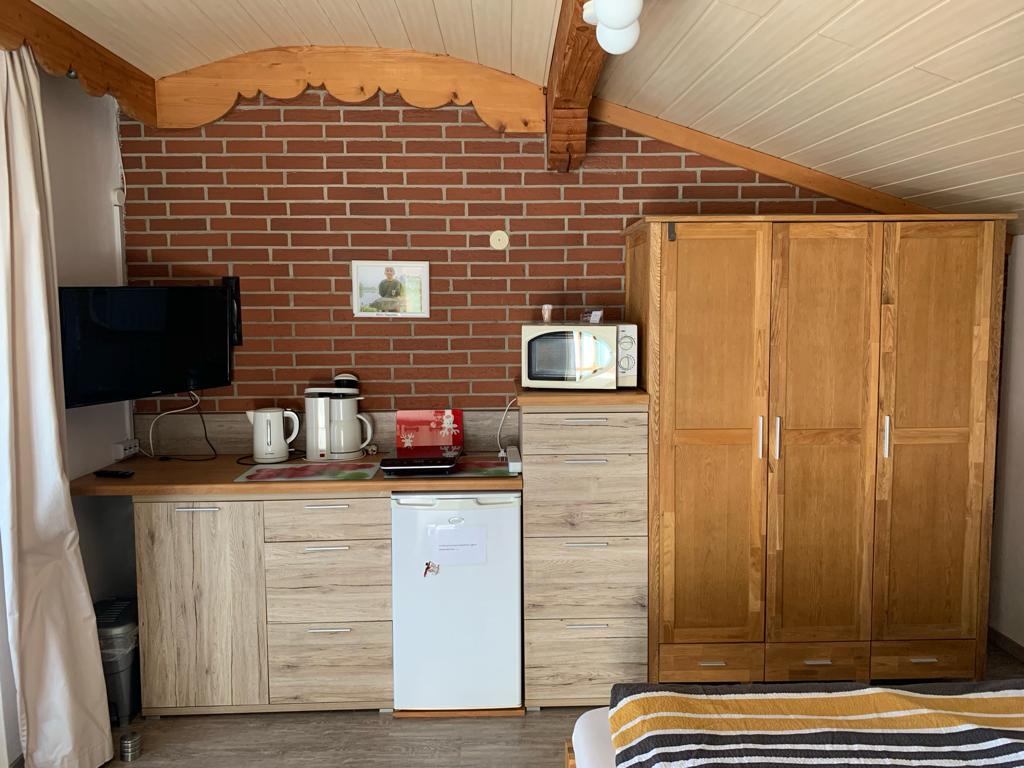 - Eine Kochnische ist vorhanden (Kühlschrank, Herd, Mikrowelle)